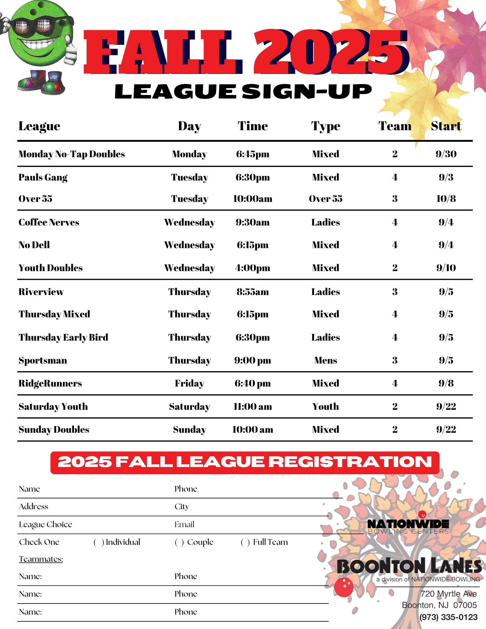 Open Bowling Times: It’s always best to call to verify that there are open lanes! 973-335-0123