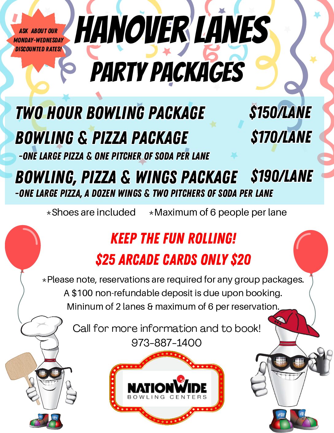 Open Bowling Times: It’s always best to call to verify that there are open lanes! 973-887-1400